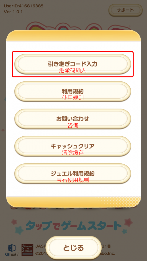 1. 重启游戏,进入标题界面,点击右上角“サポート”按钮