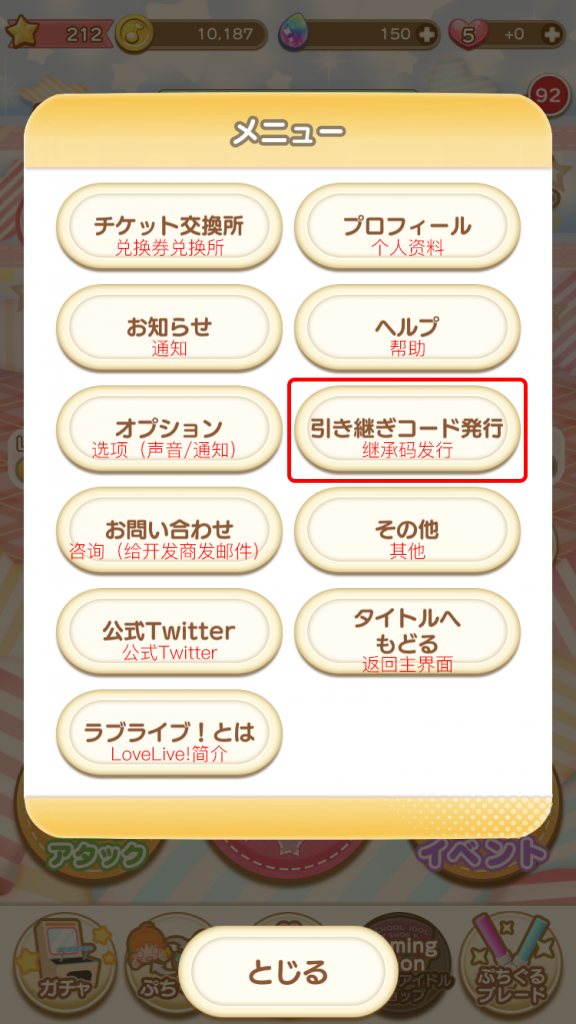 2. 弹出来一个选项菜单,选择“引き継ぎコード発行(继承码发行)”