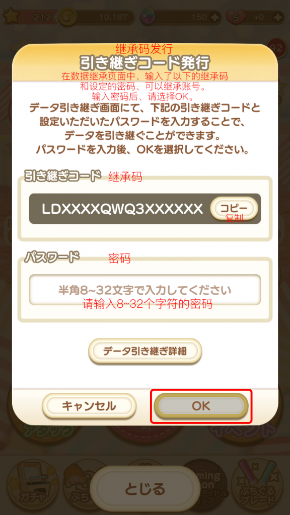 4. 输入继承码和继承密码,按“OK”即可完成账号继承(这边就不演示了)