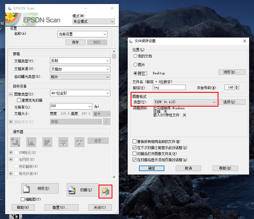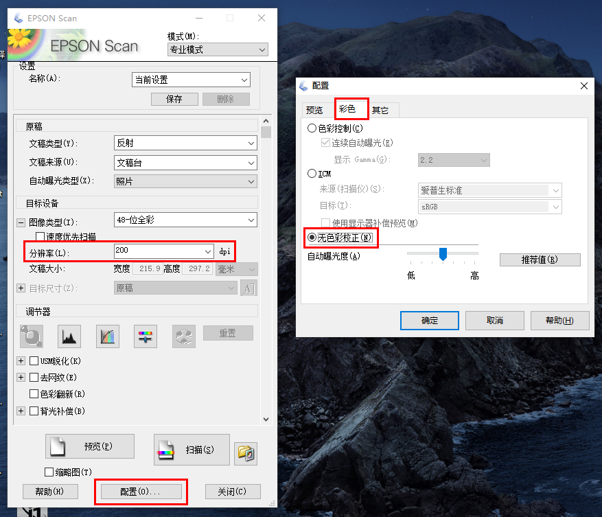 校色开始前需要对扫描仪进行设置 关闭所有色彩调整 分辨率设置为200DPI 输出格式设置为TIF