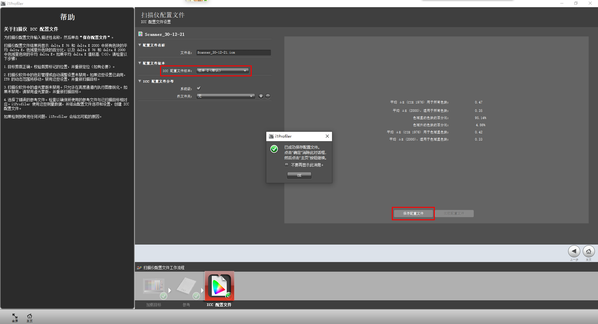 点击保存配置文件 软件会把你扫描出的色块和标准的色块进行对比 计算差值 生成出校准文件